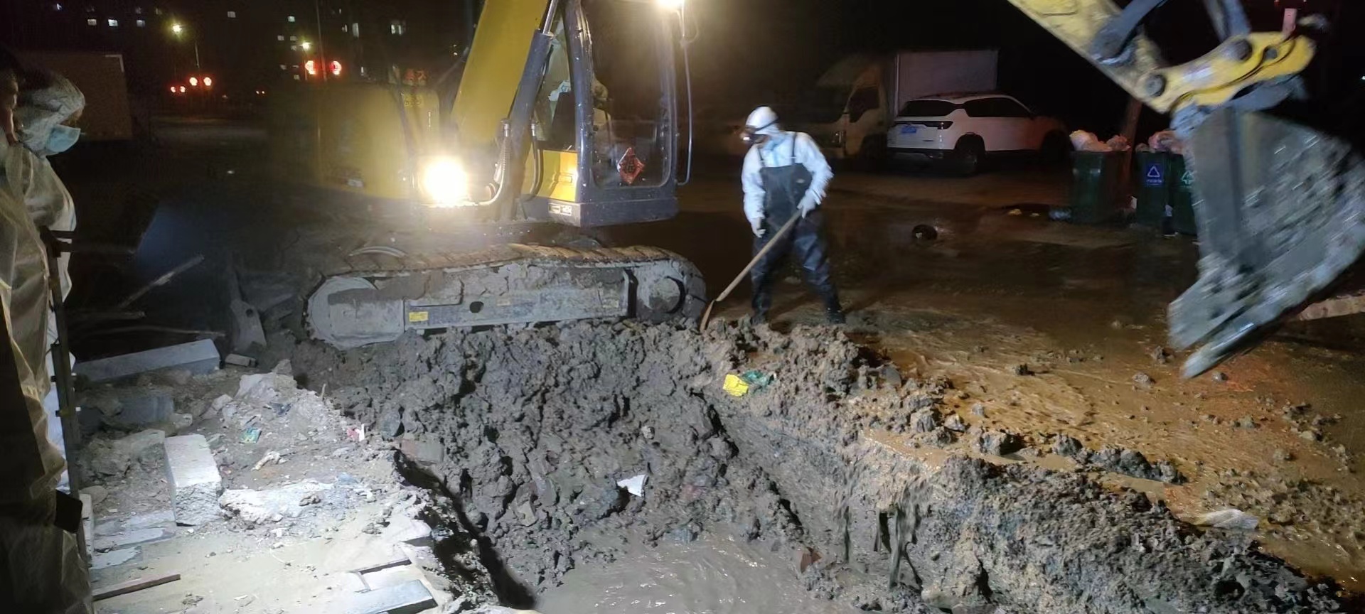 3月15日晚9點多,鲅魚圈分公司接到宋屯小區(qū)物業(yè)的求助電話,小區(qū)內(nèi)主路有大量積水,疑是自來水管道漏水,宋屯小區(qū)全部停水,分公司維修隊全體成員在隊長唐有的帶領下,迅速做好個人防護,對人員和設備及材料進行消殺后,第一時間奔赴漏水現(xiàn)場。經(jīng)詳實探查發(fā)現(xiàn)是通往宋屯小區(qū)的供水DN900mm主管道管網(wǎng)漏水,現(xiàn)場電、氣、通訊等各條線路縱橫交錯,給搶修工作帶來巨大不便,唐有和隊員們迎難而上,在零下10多度的低溫下輪流上陣,用鐵鍬一點一點掏挖出操作空間。厚重的防護服、護目鏡等防護用具使搶修人員們的動作顯得有些笨拙,憑借著豐富的搶修經(jīng)驗,夜里12時許將漏點挖出,直至凌晨1點半,恢復了宋屯小區(qū)的正常供水。
