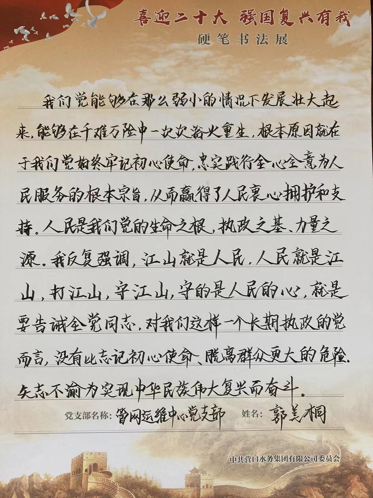 為深入學(xué)習(xí)貫徹習(xí)近平新時(shí)代中國特色社會(huì)主義思想,結(jié)合“強(qiáng)國復(fù)興有我”群眾性主題宣傳活動(dòng),水務(wù)集團(tuán)組織開展“喜迎二十大 強(qiáng)國復(fù)興有我”硬筆書法展。
